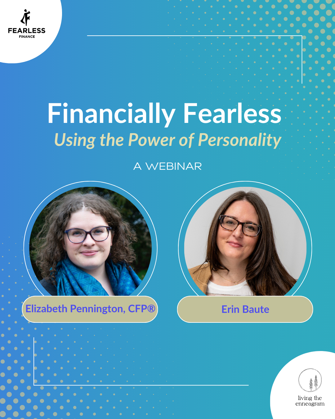 Join Elizabeth Pennington, CFP® of Fearless Finance and Erin Baute, Enneagram Expert of Living the Enneagram, as they walk you through how your personality plays a role in your financial health and what you can do to take steps towards a financial future that serves YOU. Elizabeth and Erin will walk you through Fearless Finance's 5 Steps to Financial Wellbeing while using the power of your Enneagram Type!